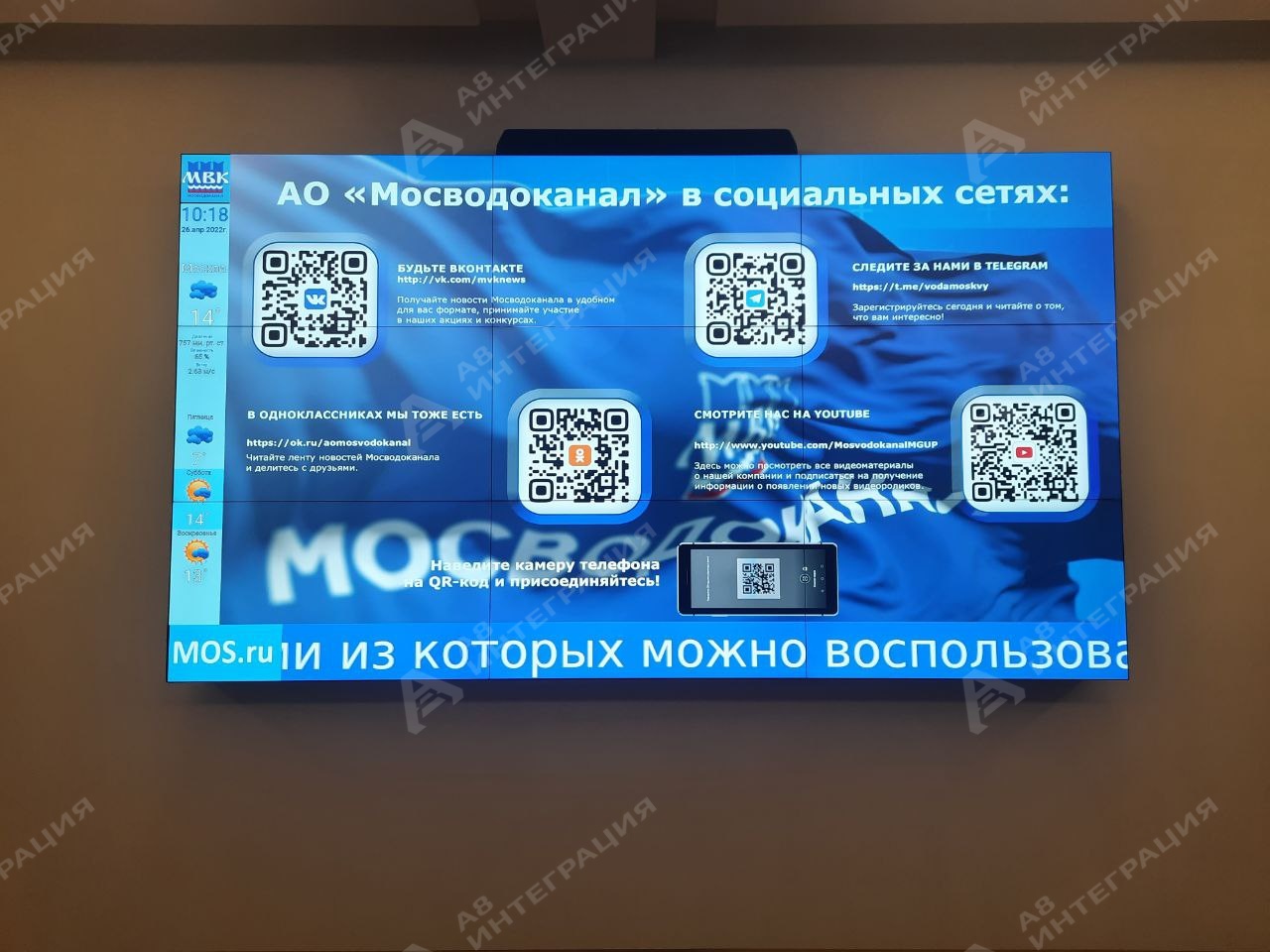 Нашей компанией был реализован проект видеостены в холле центрального офиса Мосводоканала на базе панелей для видеостен Hyundai D55RFN с ультратонким швом 0.88 мм. В качестве источника видеосигнала был использован сетевой медиаплеер Brightsign XT1144 имеющий вход HDMI, что позволяет при необходимости транслировать эфирное и спутниковое телевидение непосредственно на видеостену. Заказчик также размещает на видеостене живую RSS-ленту с новостями города Москвы и отображает виджет погоды, обновляемый в реальном времени.